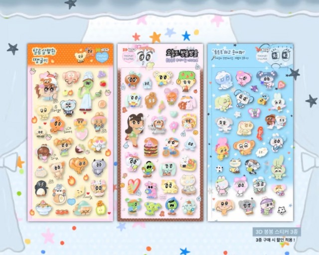 韓国限定 THE PURI VILLAGE 3種セット 3D CRYSTAL STICKER 立体 シール ステッカー ぷっくり クリスタル プリビレ 韓国作家 デザイン